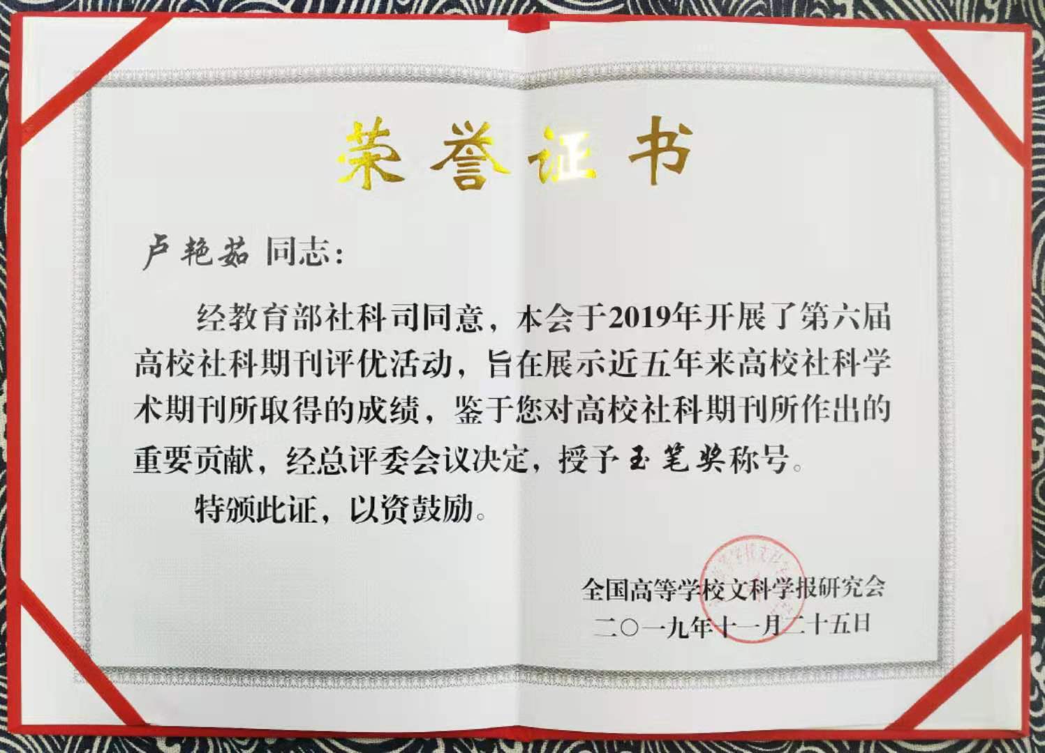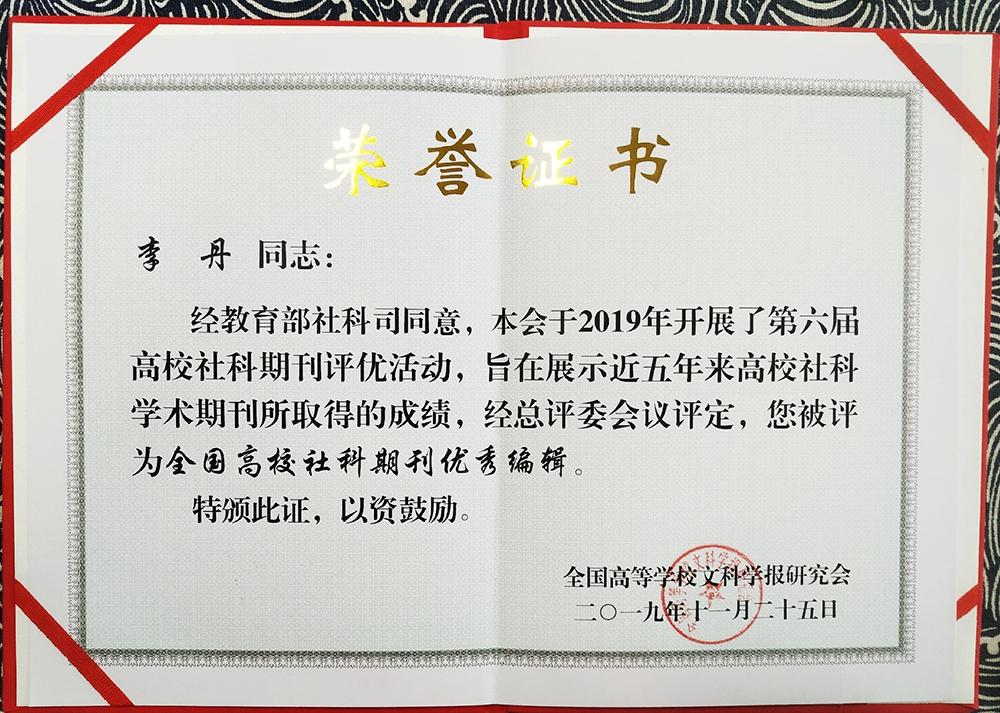 2019年11月26日,经教育部社科司同意全国高等学校文科学报研究会组织的第六届全国高校社科期刊评优活动结果揭晓,我校学报获多项荣誉称号。其中,《金融理论探索》获评“全国高校社科优秀期刊”,编辑部李丹获评“全国高校社科期刊优秀编辑”,卢艳茹被授予“玉笔奖”称号。
