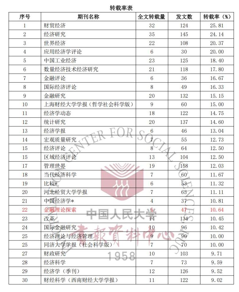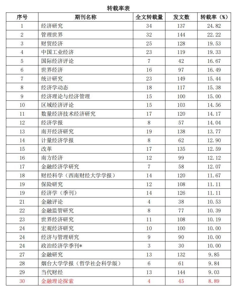 近日,中国人民大学书报资料中心发来喜报,根据中国人民大学书报资料中心《复印报刊资料转载数据研究报告(2024年度)》显示,2024年《金融理论探索》转载情况在“应用经济学刊”中,转载率表序号为30,即转载率排名第30名。