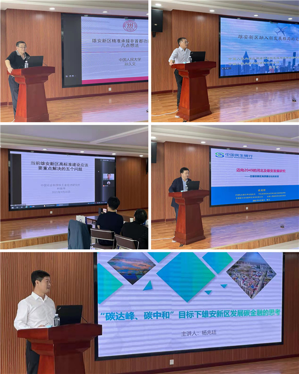孙久文作题为“雄安新区精准承接非首都功能疏解的几点想法”的主题演讲。他就雄安新区发展相关问题:解决定位高与基础薄弱的问题、解决人从哪里来的问题、解决公共服务先行的问题、解决建设资金来源问题、解决房产使用问题等,同与会专家学者进行了探讨交流。张可云作题为“雄安新区融入新发展格局的定位”的主题演讲。他提出,在新发展格局下,雄安新区是外循环中的高技术输出地与国际合作的重要节点,是内循环的辐射节点和引领城市,雄安新区应积极融入国内国际两个循环中,推动人类命运共同体构建,推动国际外循环的公平市场建设,引领世界发展。中国社会科学院工业经济研究所区域经济室主任叶振宇在线作题为“当前雄安新区高标准建设应该要重点解决的五个问题”的主题演讲。他详细阐释了雄安新区城市建设发展投融资、雄安新区承接重大标志性北京疏解项目、新型城镇化、雄安新区行政区划与干部队伍建设、雄安新区“地位”等问题,并与各位专家学者展开深入交流。之后,黄剑辉作了题为“迈向2049的河北及雄安发展研究”的主题演讲。他通过分析河北省经济社会发展现状及存在的突出问题、河北省经济发展潜力与空间以及国外资源型城市转型发展模式的启示与经验借鉴,提出河北省中长期发展路径、政策建议和雄安新区发展建设新思路。杨兆廷作题为“‘碳达峰、碳中和’目标下雄安新区发展碳金融的思考”的主题演讲。他详细介绍了中国碳排放的现状以及“双碳”目标的背景,并结合雄安新区的发展定位,提出对雄安新区发展碳金融的几点思考。主题演讲结束后,参会专家学者围绕“金融学术期刊助力雄安新区高质量发展路径思考”主题进行深入讨论、热烈发言。